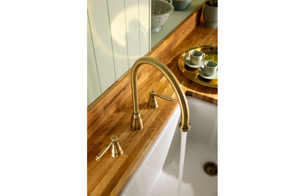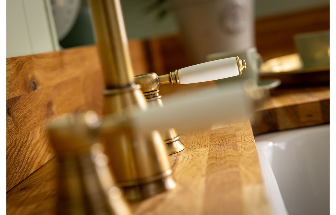 A classic Abode Oxbury tap in antique brass with a brushed finish