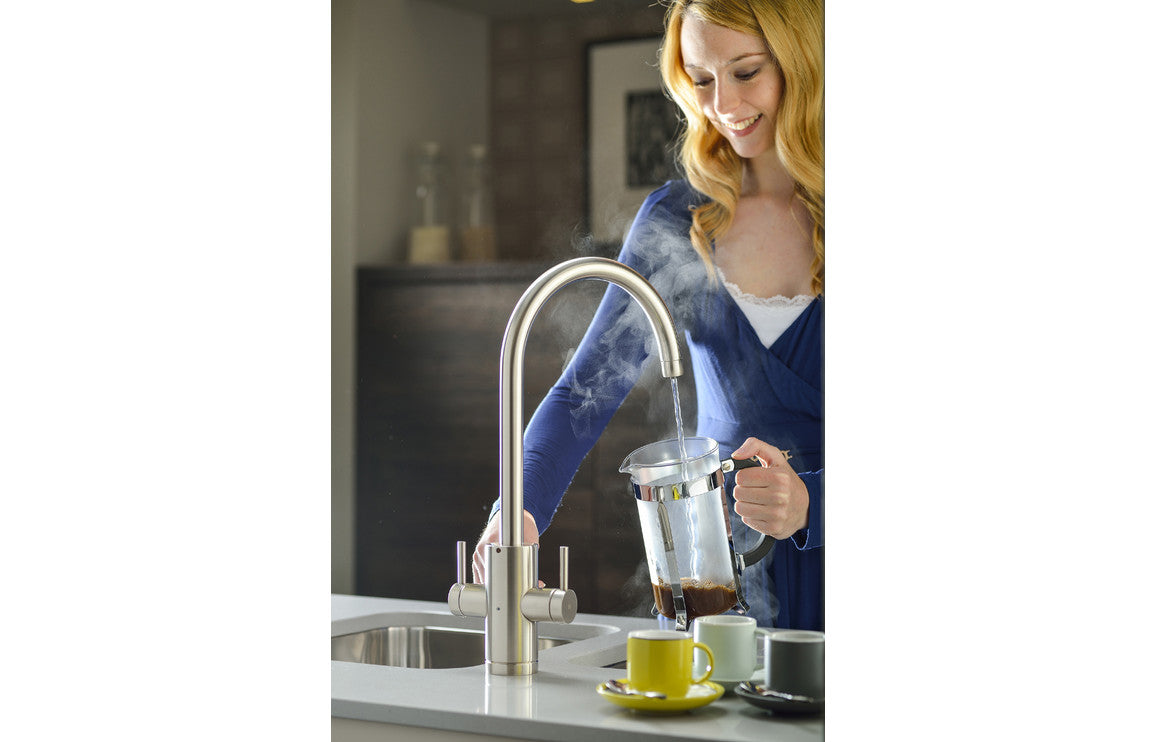 Stylish 4 way mixer tap delivering domestic hot and cold ambient and 80-98°C filtered water