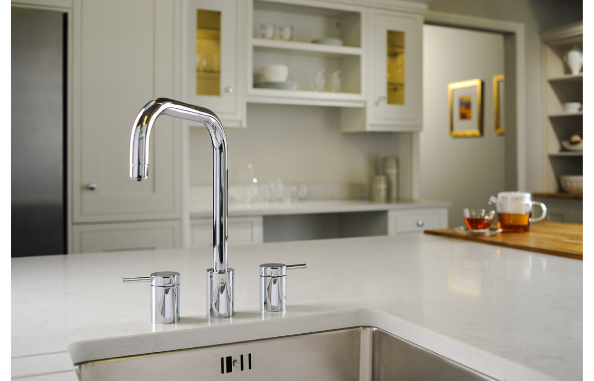 Stylish 4 way mixer tap delivering domestic hot and cold ambient and 80-98°C filtered water